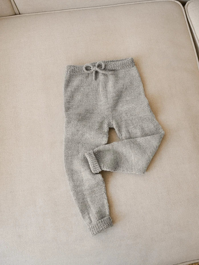 The pants are knitted top down, with double ribbing at the waist and short rows at the back for a good fit. The ribbing around the legs is knitted extra long, so it can be folded up and the trousers last a long time. You can choose whether you want an elastic band or a string for the drawstring at the waist.