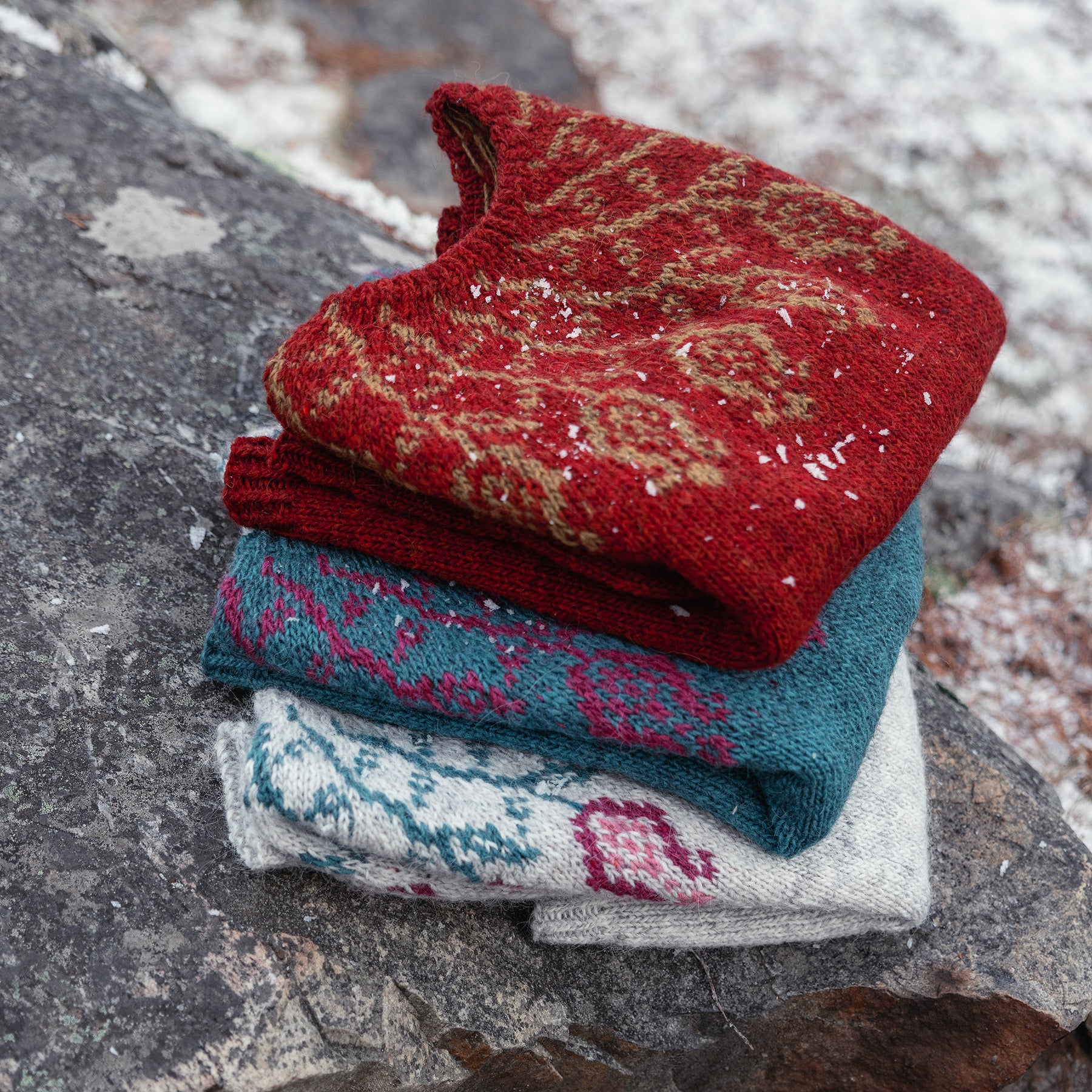 Tarvikkeet: Pyöröpuikot 3,50 cm 40 cm ja 80-100 cm. Pyöröpuikot 4,50 mm 40 cm ja 80-100 cm. Sukkapuikot 3,50 mm ja 4,50 mm, silmukkamerkkejä, tylppäkärkinen neula ja sakset.